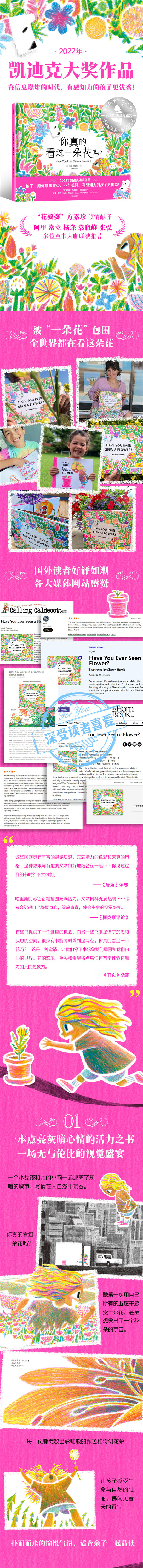 ① 2022年凯迪克大奖作品,“花婆婆”方素珍倾情献译。全世界都在看“这朵花”!国外读者好评如潮,《纽约时报》《柯克斯评论》《出版人周刊》《书页》杂志等各大媒体网站盛赞。阿甲、常立、杨涤、袁晓峰、张弘等多位童书大咖联袂推荐。在信息爆炸的时代,有感知力的孩子更优秀! ② 这是一本点亮灰暗心情的活力之书,一场无与伦比的视觉盛宴。每一页都绽放出彩虹般的颜色和奇幻花朵,让孩子感受生命与自然的壮丽,仿佛闻见春天的香气。扑面而来的愉悦气氛,适合亲子一起品读。 ③ 启发感知力 创造力,这本书带你打破惯常视角,换个角度看世界,开启一场色彩与感官的想象之旅。