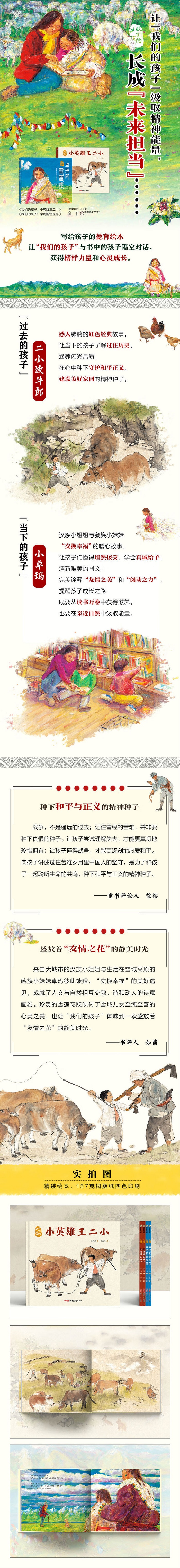 “我们的孩子”系列图画书以亲切质朴的文字和洋溢本土气息的画风,讲述生活在不同时期、地域和民族的中国孩子的故事,体现主人公沉着勇敢、互助包容等美德善行,以小见大地勾勒出“我们的孩子”闪光动人的精神面貌。系列图画书引导当下的孩子穿越时空与小主人公进行对话交流,在触及心灵的感动共鸣中延展生命宽度,汲取榜样的力量,涵养对理想、对信念的守护之力,对祖国、对家乡的热爱之情和对乡邻乃至对陌生人的给予之心。 《卓玛的雪莲花》用暖心的笔调讲述来自大城市的汉族小姐姐与生活在雪域高原的藏族小妹妹卓玛的美好遇见,描绘出人文与自然相互交融、谐和动人的诗意画卷。不同的生存空间带给汉族小姐姐和藏族小妹妹不同的生活体验,也让她们拥有不同的心灵期许——因为由心而发的馈赠和分享,两个女孩都收获了自己梦寐以求的礼物,拥有了一段珍贵的时光记忆。全书用油画来摹写雪域高原的风光人情,以珍贵的雪...