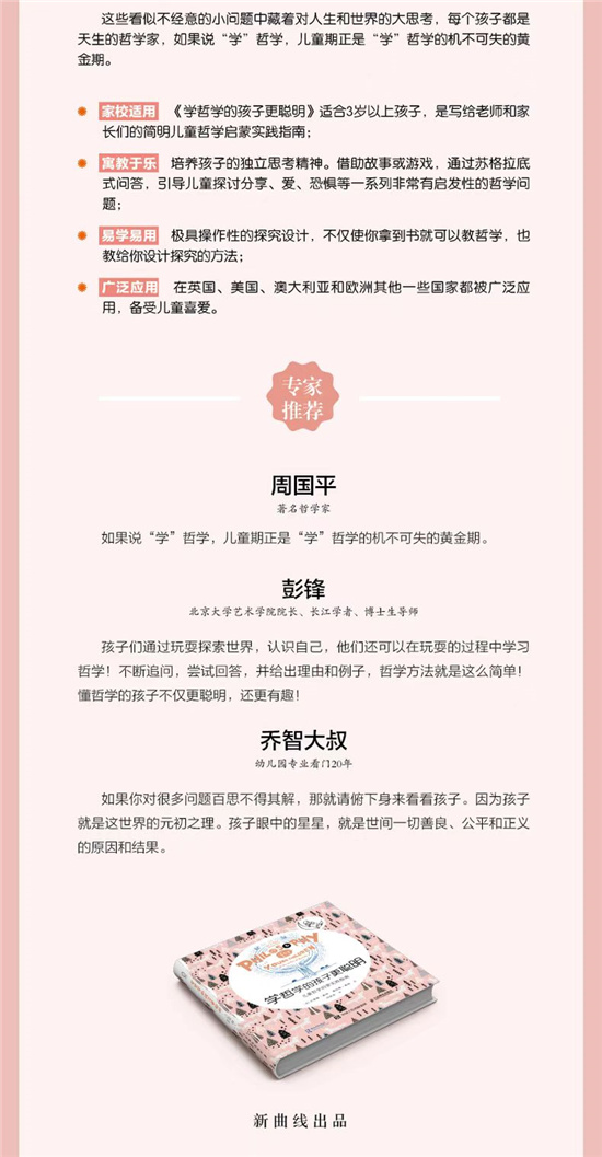 哲学的学习对于培养孩子们的理性思维、批判与质疑、勇于探究、学会反思等核心素养具有非常重要的意义 由一位哲学教授和一位从教数十年的小学教师合著,兼顾了实操性和专业性,是一本易操作而又意义深刻的儿童哲学启蒙图书。 以生动活泼的语言,结合一些贴近儿童生活的故事和游戏,寓教于乐,带领孩子们在玩的过程中完成哲学探究。 每一章给出了明确的目标和实施哲学探究的具体步骤,即使是没有哲学背景的人也可以轻易上手。 哲学家周国平、北京大学艺术学院院长彭锋、乔智大叔倾力。 已在英国、美国、澳大利亚和欧洲其他一些国家得到广泛应用,并深受孩子们喜爱。