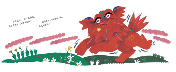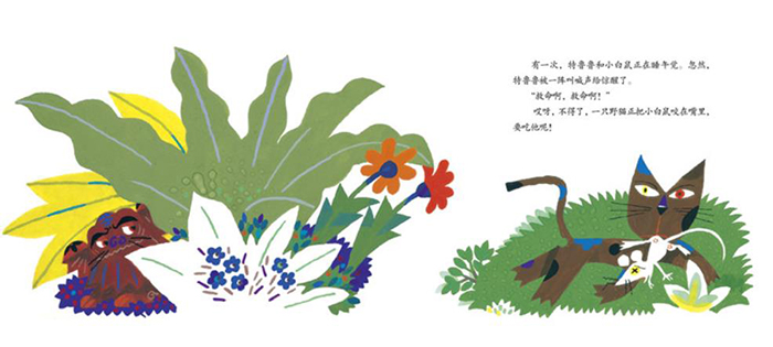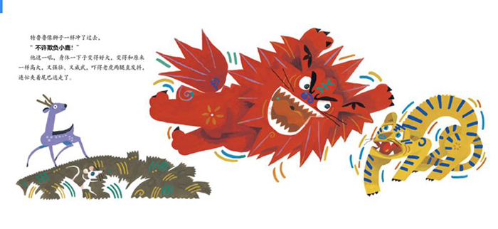 《胆小狮特鲁鲁》是一本让孩子学会勇敢、正确面对自己的绘本。充满想象力、夸张诙谐的情节和一波三折的结构引人入胜。特鲁鲁狮子长得高大、强壮,看起来很威武。可是,谁也不知道,特鲁鲁狮子有一个怪毛病,那就是,它的胆子非常非常小。头上落下一片树叶,特鲁鲁狮子也会抱着脑袋,吓得发抖。有一次,它遇见一只老虎。老虎朝它看了一眼,它吓得拼命逃。逃啊,逃啊,特鲁鲁狮子的身体越变越小,变得像豹子一样大了。后来,像老鼠一样小的特鲁鲁狮子遇见了一只小白鼠,它们互相看了一眼,都吓坏了。糊里糊涂的,它们两个都朝一个方向跑。*后才发现,原来对方其实一点也不可怕。