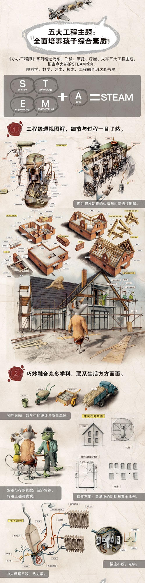 这套《小小工程师》系列来自享誉国际的捷克出版社B4U,是一套全新的“技术童话”。它以科技感满满的机械和工程知识为骨架,以主人公小老鼠阿尼的成长励志故事为血肉,加上有质感的复古画风和工程级的立体透视图解,共同构成了这套科学性和文学性兼备的童书作品。