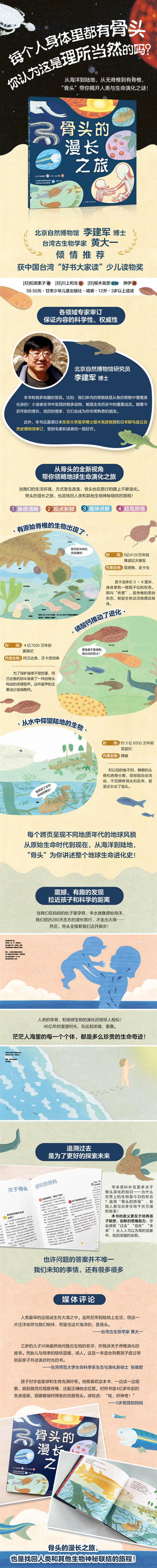 人类的远祖诞生在大海,后来来到陆地上。这一切都是因为骨头!当生活环境、方式发生改变,骨头也在旅行的路上不断变化。有趣的是,宝宝在妈妈肚子里的孕育过程,和几十亿年前地球生命演化历程惊人相似! 这本书从骨头的视角,用全新的方式讲述生物进化史。亲切、有趣的角度拉近孩子和科学的距离,同时告诉孩子关于每个人出生的秘密:你像鱼宝宝一样从大海中来,在骨头的支撑下迈开脚步。每个来到世上的生命,都是珍贵的奇迹! 《骨头的漫长之旅》向小朋友们讲述地球上生命的形成和发展历史。还能知道,我们体内的骨骼就是从鱼的骨骼中慢慢演化来的!你在书中发现的很多动物,都是我们生命历史中的重要成员。随着今后年龄的长大,阅读书籍的增多,它们会成为你非常熟悉的朋友。