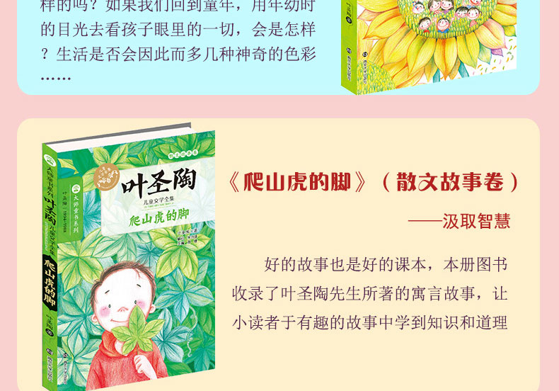 《叶圣陶儿童文学全集(共6册)》分为六册: 《稻草人》是叶圣陶童话寓言集,精选了《小白船》、《一粒种子》、《一粒种子》等寓言故事。《古代英雄的石像》收入叶圣陶对现成的童话、寓言、小说、民间故事等进行的再创作作品。包括《古代英雄的石像》、《皇帝的新衣》、《书的夜话》等。《海上的朝阳》精选了叶圣陶先生的若干篇经典散文,包括《没有秋虫的地方》、《可爱的睡莲》、《大家欢迎的邮递员》等。《爬山虎的脚》收录了散文8篇和寓言23篇。《儿童节》收录了15篇小说。《风浪蜜蜂》收入二十世纪三十至五十年代叶圣陶为儿童创作的诗歌和童话剧。