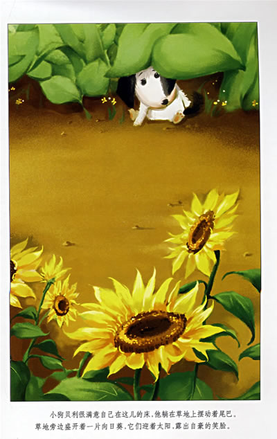 一只名叫“贝利”的长毛小狗,看见几个人拿着大剪刀,准备剪下盛开的向日葵。这时候,一种藏在心中的正义感,使小狗变得无比勇敢,他毫不犹豫地扑过去,赶走了那几个坏家伙……故事的结尾是:“小狗贝利睡在草地上,向日葵守护着他,阳光为他铺上一层金色的丝被。”(《小狗与向日葵》)