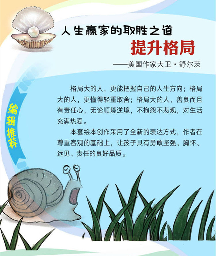 本套绘本创作采用了全新的表达方式,作者在尊重客观的基础上,让孩子具有勇敢坚强、胸怀、远见、责任的良好品质。