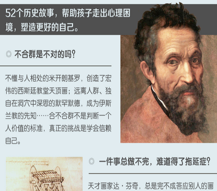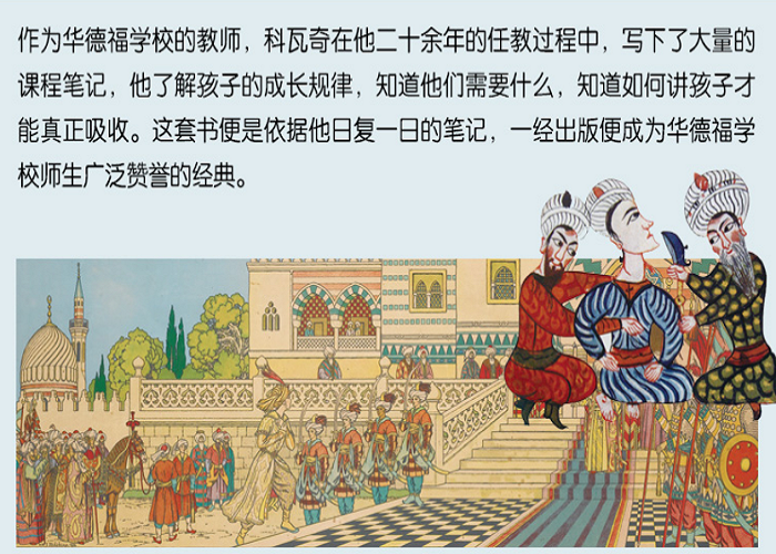 尊重儿童心理,使历史故事与他们身心相呼应。 12到13岁时,孩子与家长的情感纽带已松弛,随着童年离去幼小的心灵初次体味到一种孤独感——广阔又陌生的世界在面前展开,让人又害怕又向往。这一阶段的孩子,他们的内在心境与在陌生之地探险的哥伦布、走在时代前列孤独研究的达·芬奇、宗教裁判所的伽利略、挑战教会权威的马丁·路德……相一致,这些人的故事能引起他们的共鸣。 此时他们具备了一定的抽象思维,只讲故事已经不能解答孩子内心的疑惑,还有必要让他们看到不同事件之间的关联,比如指出文艺复兴在艺术中展现的精神转变,在地理大发现中扮演着引领和导向带角色,并导致了宗教改革的爆发…… 逐步增加年代、历史事件的联系,培养历史发散思维。 进入青春期之后,单纯的故事不再能够满足孩子的好奇心和对知识的探索欲。所以在这本大发现中,科瓦奇逐步增加了时间、年代,因为这时候的孩子已经开始具备对时间的抽象能力。在故事之外,还揭示历史事件之间的联系,比如在文艺复兴时期人所表现的精神转变,在地里大发现中扮演着引领的角色,并导致了宗教改革的爆发。这些联系的讲述,会帮助孩子发散思维,获得一种更全面的历史视野。 一位英国教师二十余年的关怀,华德福教育的经典教材 作为华德福学校的教师,科瓦奇在他二十余年的任教过程中,写下了大量的课程笔记,他了解孩子的成长规律,知道他们需要什么,知道如何讲孩子才能真正吸收。这套书便是依据他日复一日的笔记,一经出版便成为华德福学校师生广泛赞誉的经典。 精美的插图,给孩子文字之外的想象和美的熏陶。 近300幅精美插图,展示中世纪有关的壁画、油画、版画……不要错过每一章节的装饰图案,那里藏着中世纪的方方面面