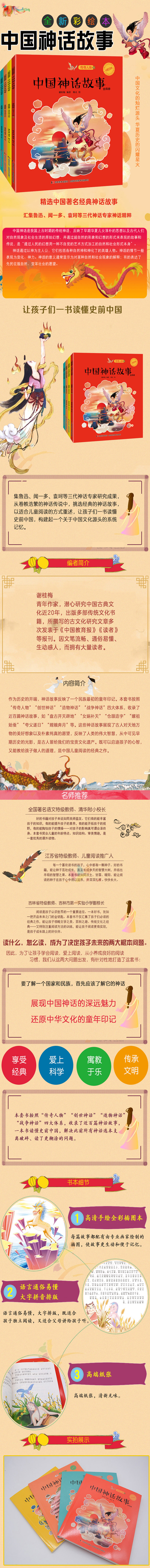 作为历史的开端,神话故事反映了一个民族*初的童年印记。本套书按照“传奇人物”“创世神话”“造物神话”“战争神话”四大体系,收录了近百篇神话故事,如“盘古开天辟地”“女娲补天”“仓颉造字”“嫘祖始蚕”“夸父逐日”“嫦娥奔月”等。这些神话故事展现了古人对天地万物的美好想象以及朴素纯真的愿望,反映了人类的伟大智慧,从中可见早期历史的光影,是古人留给我们的宝贵文化遗产。既可以启迪孩子的心智,又能教给孩子做人的道理,是中国儿童阅读的经典之作。