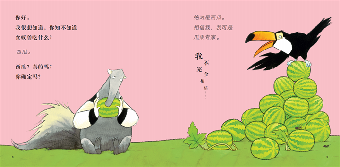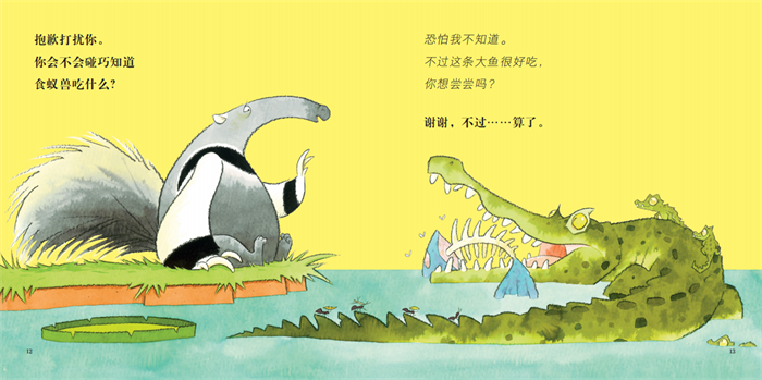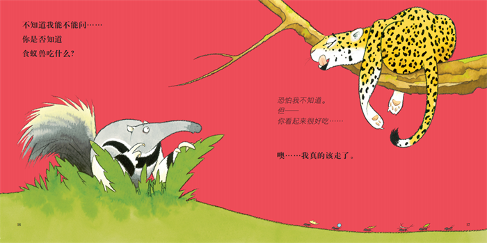 在书中,食蚁兽向遇到的动物提问。简单的对话体贯穿全书。但同样一个问题,食蚁兽的语气却千变万化,“抱歉打扰”“你知不知道”“我想你不知道”“会不会碰巧知道”等说法不断变换。生动地刻画了初次探索世界的孩子的心理变化,趣味盎然。