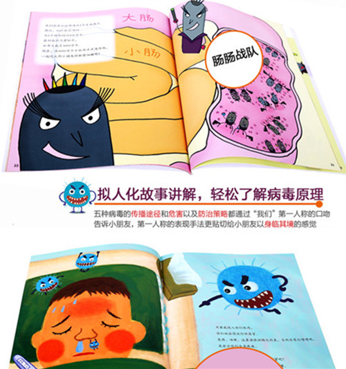 该系列针对五种常见病毒讲解了病毒的传播方式以及防治攻略,由免疫学、病毒学博士撰写,专家教您预防传染病毒,拟人化的讲解揭开病毒传染的秘密,绘本中流行性感冒病毒被拟人化作“流感大人”,麻疹病毒被拟人化作“麻疹小将”,诺如病毒被拟人化作“诺如小子”,水痘病毒被拟人化作“水痘忍者”,肠出血性大肠杆菌O157被拟人化作“肠肠战队”。拟人化讲解形象生动易于让孩子接受。