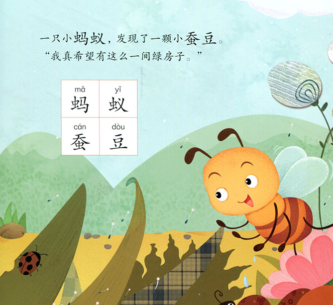 一只小蚂蚁发现了一颗蚕豆,住了进去,之后,一只小山羊又发现了这颗住着蚂蚁的蚕豆,把它种在了土里。一段时间后,蚕豆苗上结出了鸡蛋般的大蚕豆,小山羊就把它摘了下来,掰成两半,结果从里面出来一只大蚂蚁。最后,小山羊和大蚂蚁成了好邻居。