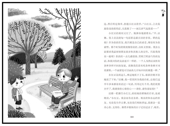 现在来看“小红豆”系列,思繁给自己设了一局很大的棋。在这个棋面上,有中国式的内敛含蓄,有法国式的浪漫精致,还有其他西方国家独具特色的思想与文化……它们齐头并进,旗鼓相当。而思繁的才气也恰恰体现在此处,她很聪慧敏锐地找寻到了解开这个困局的“钥匙”——孩子。孩子的世界是相通的,甚至是超越文化差异的,他们有共同的情感表达,有共同的感触体验。所以在下这盘棋时,思繁显得自如安定、游刃有余。——曹文轩