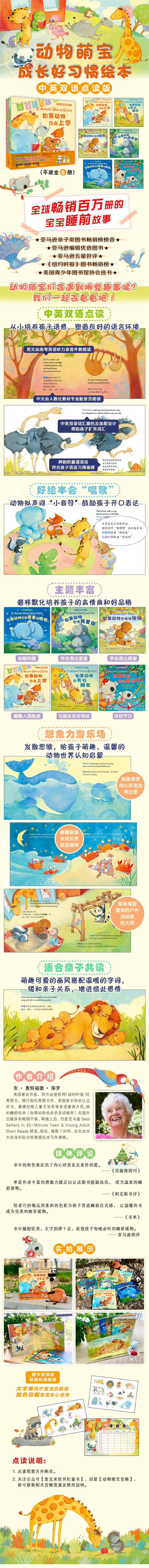 如果动物萌宝们也像宝宝一样要去上学、交朋友、亲亲说晚安、表达爱意、庆祝节日,会遇到哪些有趣的事呢? 它不仅是一套给宝宝的英语启蒙书;也是一套帮宝宝认知动物世界的自然启蒙绘本;还是一套品格培养绘本。 萌趣可爱的画风搭配朗朗上口的童谣,将想象力与治愈故事融合,利用不同动物的生活习性与特点,为孩子讲述6个主题故事:包括哄睡、入园、关心朋友、学会感恩、表达爱意和庆祝节日,帮助孩子养成好习惯,健康快乐成长。