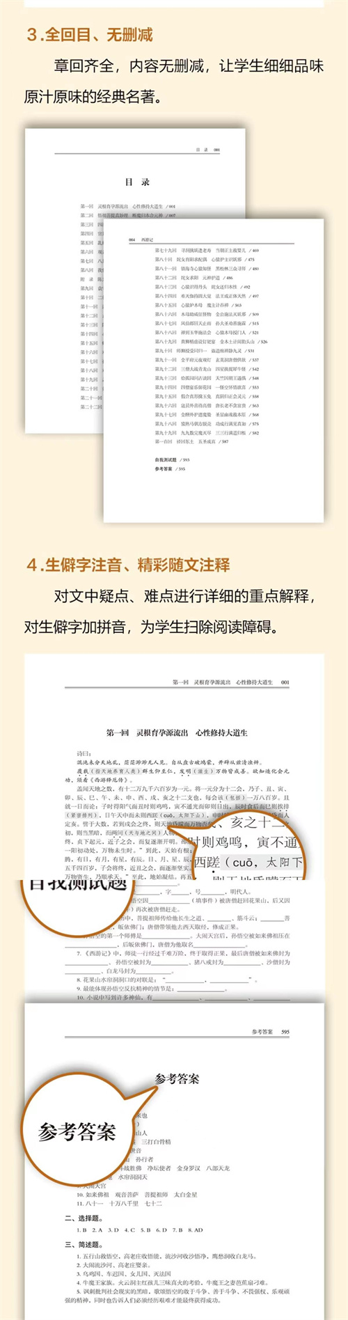 《西游记》是中国古代第一部浪漫主义章回体长篇神魔小说。今见最早的《西游记》版本是明代万历二十年金陵世德堂《新刻出像官板大字西游记》,未署作者姓名。[63]鲁迅、董作宾等人根据《淮安府志》“吴承恩《西游记》”的记载予以最终论定“吴承恩原著”。 该小说主要讲述了孙悟空出世,跟随菩提祖师学艺及大闹天宫后,遇见了唐僧、猪八戒、沙僧和白龙马,西行取经,一路上历经艰险,降妖除魔,经历了九九八十一难,终于到达西天见到如来佛祖,最终五圣成真的故事。该小说以“玄奘取经”这一历史事件为蓝本,经作者的艺术加工,深刻地描绘出明代百姓的社会生活状况。 《西游记》是中国神魔小说的经典之作,达到了古代长篇浪漫主义小说的巅峰,与《三国演义》《水浒传》《红楼梦》并称为中国古典四大名著。《西游记》自问世以来在民间广为流传,各式各样的版本层出不穷。明代刊本有六种,清代刊本、抄本也有七种,典籍所记已佚版本十三种。鸦片战争以后,大量中国古典文学作品被译为西文,《西游记》渐渐传入欧美,被译为英、法、德、意、西、手语、世(世界语)、斯(斯瓦希里语)、俄、捷、罗、波、日、朝、越等语言。