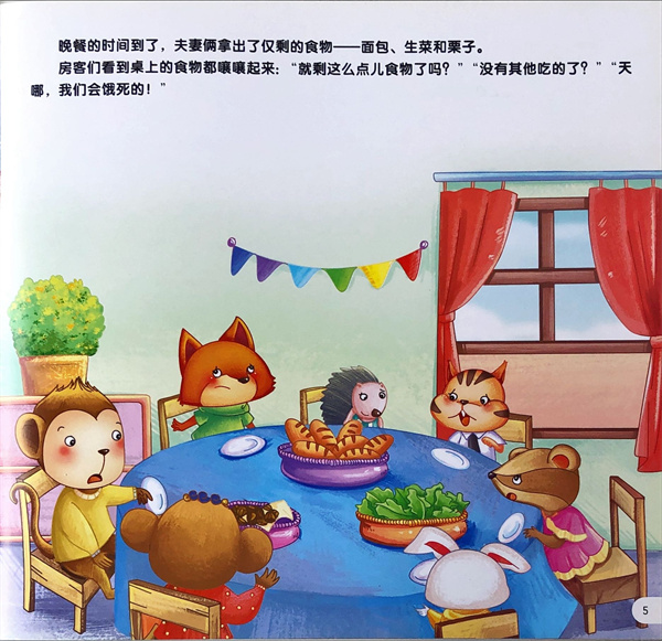 森林里暴雨下了七天七夜,动物公寓里的小动物遭遇了食物危机。现在只剩下一点儿面包、生菜和栗子了,大家都说吃不饱,需要照顾。小朋友,你来说说看,怎么分才公平呢?
