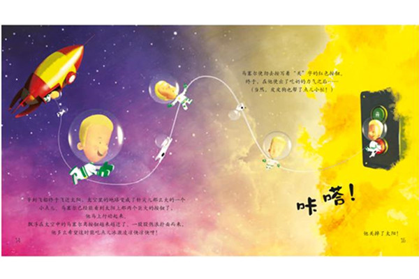 《我关掉了太阳!》:马塞尔超级喜欢冰淇淋,可是炎热的阳光让他手里冰淇淋融化了。马塞尔很生气,他脑子里冒出一个想法——把太阳关掉!抱着这样的念头,马塞尔设计了太空飞船,并坐上它飞上太空,按下了太阳的“关闭”按钮。回到地球之后,马塞尔意识到自己犯了一个大错误。眼下,他必须想办法把太阳重新打开!但是,结果会怎样?
