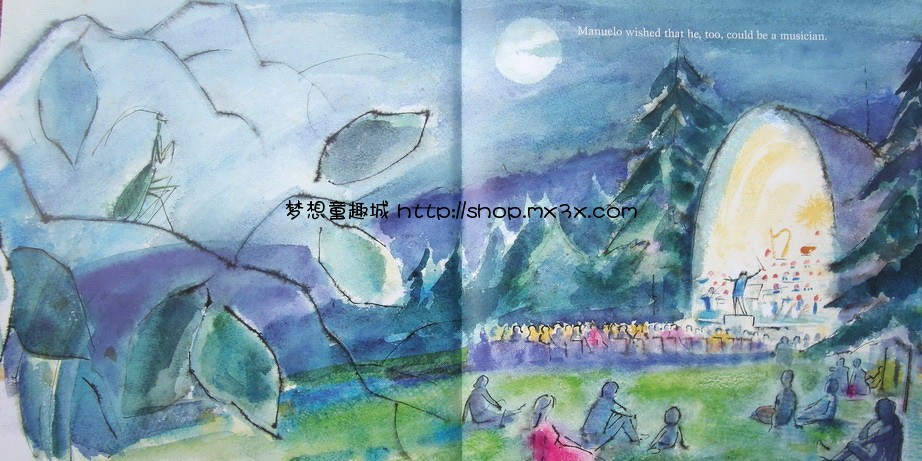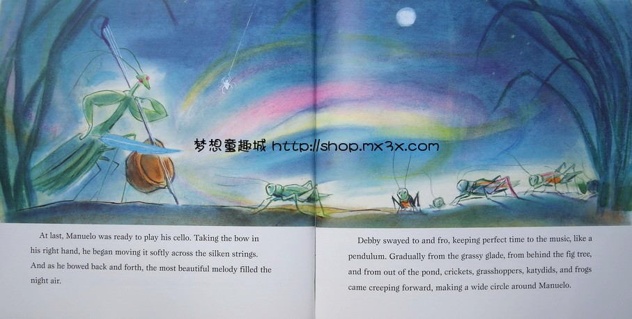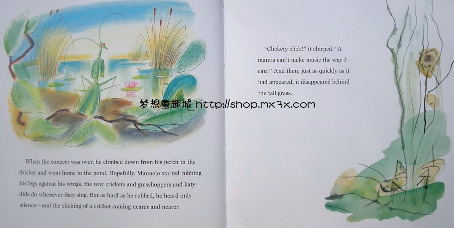 Manuelo is a praying mantis who spends summer evenings listening raptly to outdoor concerts. How he longs to join in! But though he tries to make a flute from a cattail, a horn from a trumpet flower, and a harp from twigs, nothing seems to work. But then Manuelo makes a friend who shows him how to create a cello . . . and in doing so opens the door to Manuelo�0�8s heart�0�8s desire.