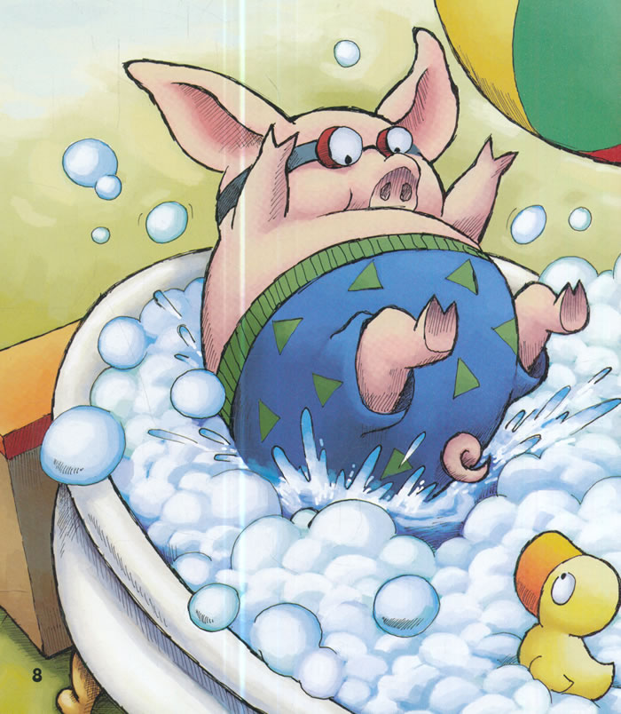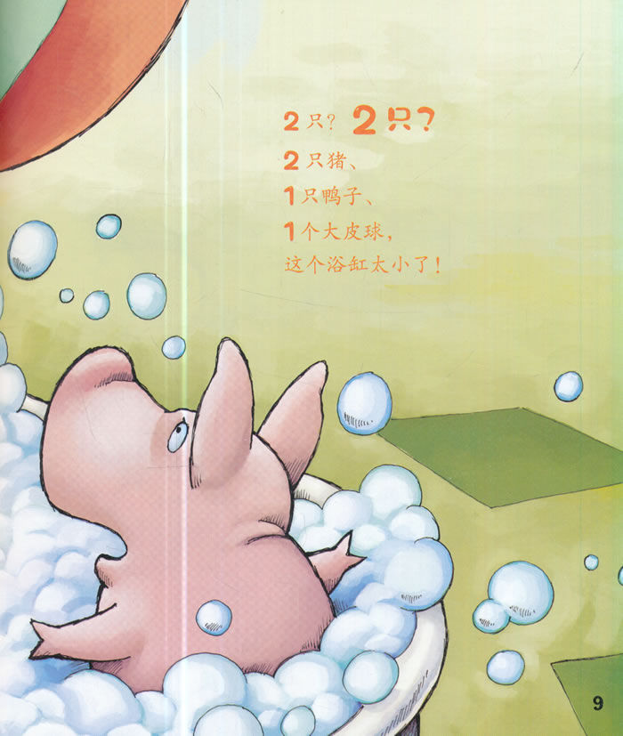 一只小猪在欢快地洗着澡,这个浴缸对于他和一只小黄鸭来说刚刚好啊。就在他正开心时,第二只小猪拿着硕大的弹力球来了;接着,是第三只小猪和第四只小猪,还有第五只、第六只、第七只小猪……后来,浴缸里挤满了十只小猪!天啊,这可太拥挤了!突然,有人喊道:“那是什么?”刹那间,小猪都跑了,浴缸里一只小猪都没有了。那到底什么呢?小猪们都跑光了吗?