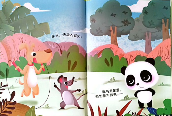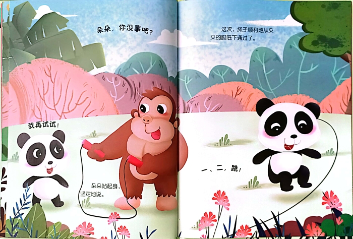 熊猫朵朵不会跳绳,对跳绳也不感兴趣。在看了大猩猩的表演后,朵朵也想学跳绳。在小伙伴们热心的指导下,朵朵学会了跳绳,她还参加了“超级动物跳绳比赛”呢。朵朵体会到了跳绳的快乐。
