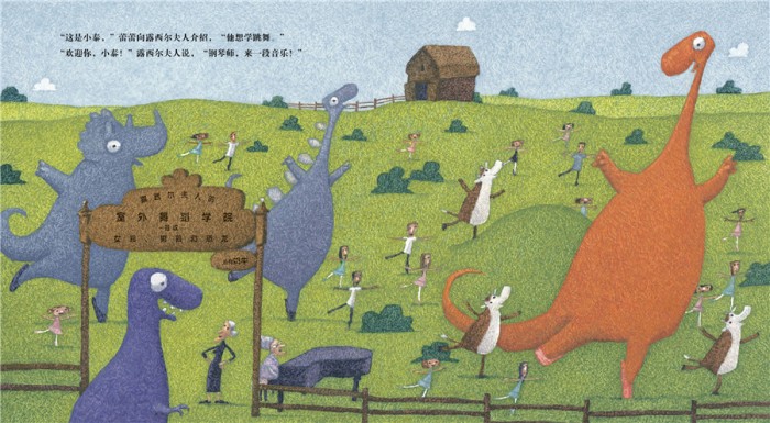一只霸王龙能在芭蕾舞台上单脚尖旋转和凌空跳吗?……在兰迪·塞西尔的图画中,巨大的跳舞恐龙和小小的孩子们形成了幽默的对比。他笔下的霸王龙是带质感的蓝色,雷龙是明亮的橙色,鲜明的大色块布满了画面。霸王龙小泰柔和圆润的身形,完全不同于他的史前祖先,非常逗人喜爱。雷龙蕾蕾的故事见于《想跳舞的雷龙》一书,在那本书里,蕾蕾找到了连恐龙也可以自由跳舞的户外舞蹈教室。是的,梦想一定能成真——就算你是一只跳舞的恐龙。 ——美国《科克斯书评》 在兰迪·塞西尔精致、富有质感的油画插图中,霸王龙小泰踮起脚尖,以迎风展翅的舞姿保持平衡,小孩、恐龙和奶牛在露西尔夫人的户外舞蹈教室跳舞,画面让人会心一笑。在舞蹈主题的故事时间,以及探讨如何找到自己的兴趣或支持别人发展兴趣爱好时,很适合阅读这本书。