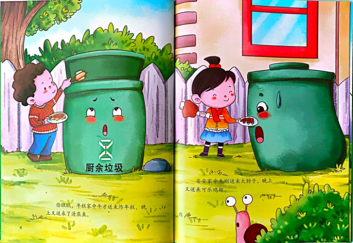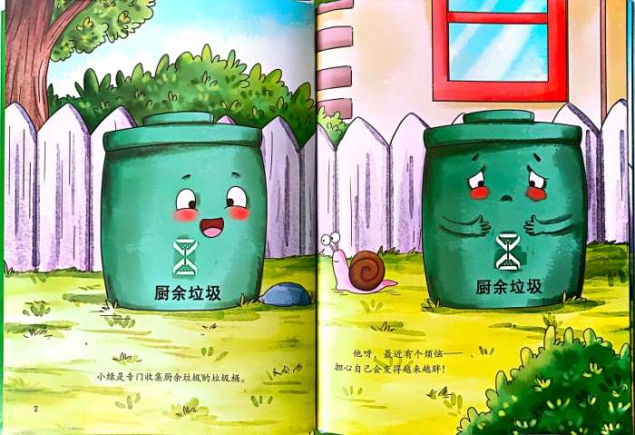 小绿是专门收集厨余垃圾的垃圾桶。他呀,最近有个烦恼——他担心自己会变得越来越胖!小区里年糕家、豆豆家、安安家最近给自己吃太多东西啦!小绿肚子撑得好难受啊!该怎么办呢?这天晚上,小绿想出了一个办法……