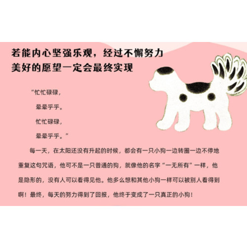三只孤儿小狗住在一个被遗忘的农场里,每一天,在太阳还没有升起的时候,有一只小狗都会一边转圈一边不停地重复一句咒语“一无所有”,他可不是一只普通的狗,就像他的名字“一无所有”一样,他看起来什么也不是,他是隐形的,没有人可以看得见他。他多么想和其他小狗一样,可以被看到啊!有一天,看得见的两只小狗被两个小孩儿带走了,丢下了看不见的一无所有。一无所有跟在他们后面追呀、追呀……后来,一只寒鸦告诉了他一个神奇的咒语,从此,他有了形状。