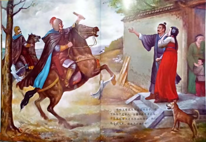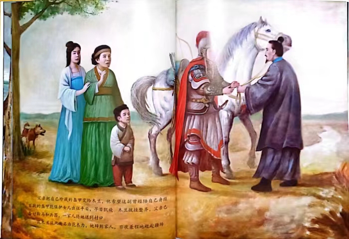 《国粹戏剧图画书》从浩瀚的中国传统戏剧海洋中遴选出能够真正代表中国传统戏剧最高艺术水准和思想性的剧目,将这些戏剧作品重新进行编写,并以图画书的形式呈现。其中,图画书《花木兰》以中国传统绘画形式塑造了英勇豪气的巾帼英雄花木兰的传奇形象,彰显了中华民族“忠”“孝”“义”等传统美德。画家采用写实风格的油画技法来进行创作,在作品中借鉴了法国画家雅克·路易·大卫新古典主义作品的风格,体现出如同大卫般的英雄主义精神。