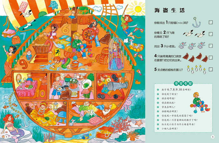 为了鼓励孩子发现线索,游戏类大画册设计了“普通任务题”和 “寻宝专家”栏目。每完成一项普通难度的任务,孩子便可勾选、标记,帮助他们培养做事情的条理性并获得成就感;“寻宝专家”通过问题提示,引导孩子通过观察、分析来寻找答案,具有鲜明的益智游戏特征,在潜移默化中培养他们的逻辑思维能力、观察力和专注力。