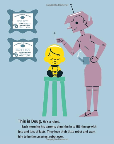 Doug is a robot. His parents want him to be smart, so each morning they plug him in and start the information download. After a morning spent learning facts about the city, Doug suspects he could learn even more about the city by going outside and exploring it. And so Doug . . . unplugs. What follows is an exciting day of adventure and discovery. Doug learns amazing things by doing and seeing and touching and listening—and above all, by interacting with a new friend.