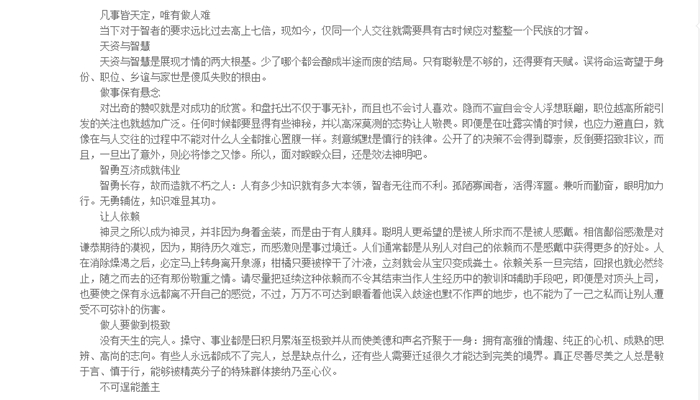 本书是本哲学箴言录。作者巴尔塔萨尔·格拉西安是西班牙著名的哲学家、文学家,本书写有300则有关做人、行事、修身的箴言录,被认为是西班牙文学中最有趣味和最能引人入胜的作品。其表现形式为格言,类似《论语》《沉思录》,这种形式也最能引发读者思索与联想。格拉西安被奉为西班牙语言文学大师,其著作被视为西班牙文学史上的哲学基石。