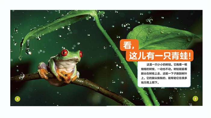 本书从美国引进,是一本《美国国家地理》专为2-4岁幼儿设计打造的科普图书。本册围绕“青蛙”这一动物主题,以简单的小故事介绍其特点、习性,为小读者普及最浅显的科普知识。图书采用整版大图配少量文字的方式编排,将简单易懂、生动有趣的知识点与高品质的照片完美融合,轻松地解答小读者诸如青蛙为什么可以跳这么高、青蛙以什么为食、青蛙如何从蝌蚪长成等问题。书后还搭配有“青蛙迷宫”等与图书知识紧密结合的小游戏,能有效地提高孩子阅读的兴趣。
