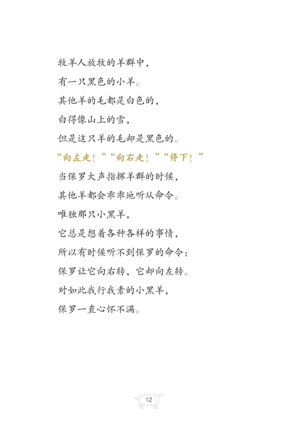 1. “不同”不是“不对”。因为人类或大或小的“求同”意识,我们经常会把“不同”归结到“不对”的范畴里。本书通过小黑羊的故事,告诉读者,“不同”仅仅是一种个体的特色,而不是“不对”。“不同”有自己的价值,“不同”让这个社会更加的完整、丰富。