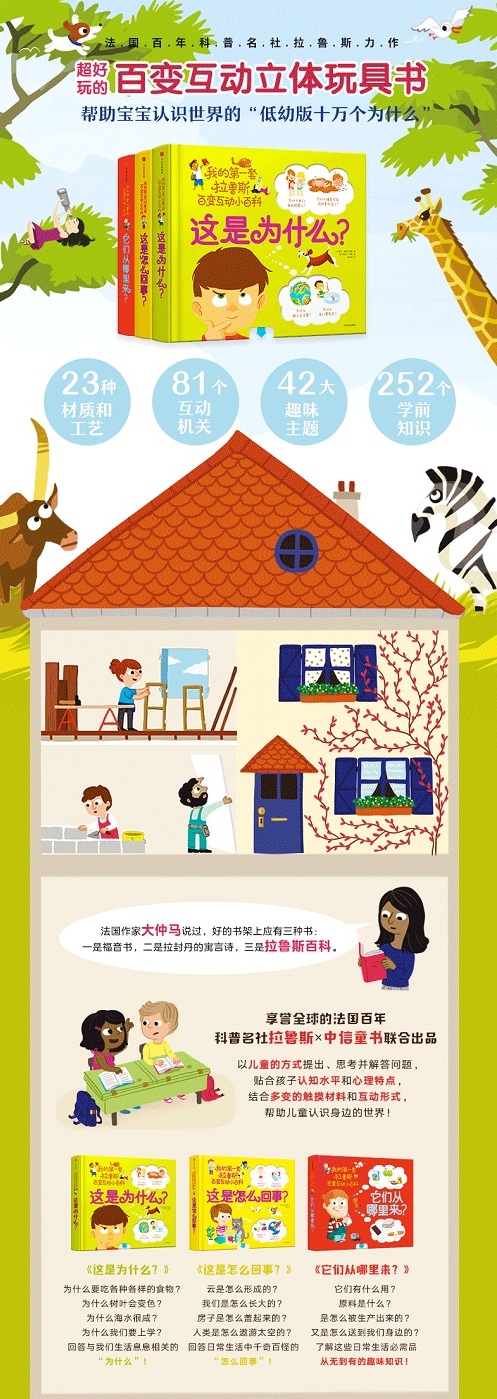 法国作家大仲马说:好的书架上应有三种书:一是福音书,二是拉封丹的寓言诗,三是拉鲁斯百科。该系列出自享誉全球的法国百年科普名社拉鲁斯,以儿童的方式提出、思考并解答问题,符合该年龄段认知水平,是儿童开始认识身边世界的“低幼版十万个为什么”。