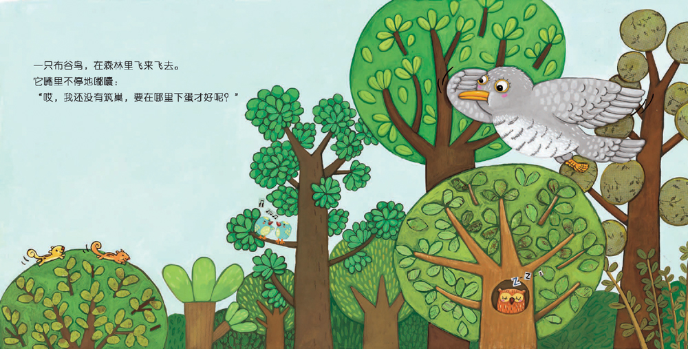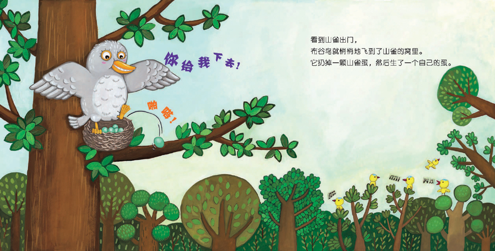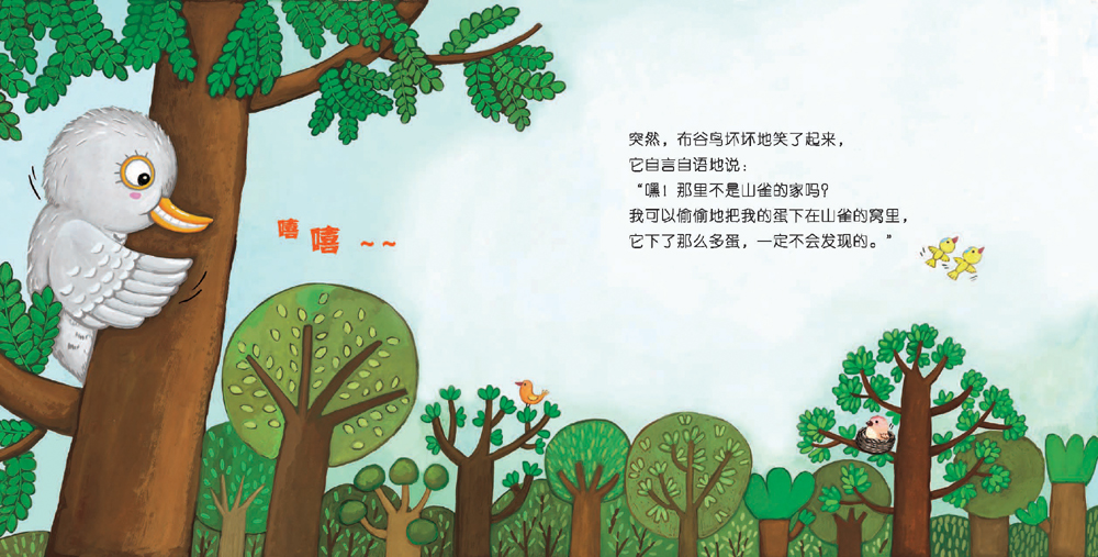 一只布谷鸟,在森林里飞来飞去。它嘴里不停地嘟囔:“哎,我还没有筑巢,要在哪里下蛋才好呢?”突然,布谷鸟坏坏地笑了起来,它自言自语地说:“嘿!那里不是山雀的家吗?我可以偷偷地把我的蛋下在山雀的窝里,它下了那么多蛋,一定不会发现的。”看到山雀出门,布谷鸟就悄悄地飞到了山雀的窝里。它扔掉一颗山雀蛋,然后生了一个自己的蛋。……