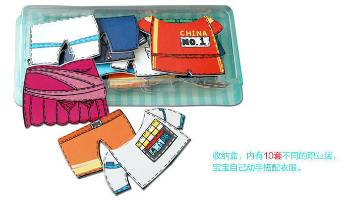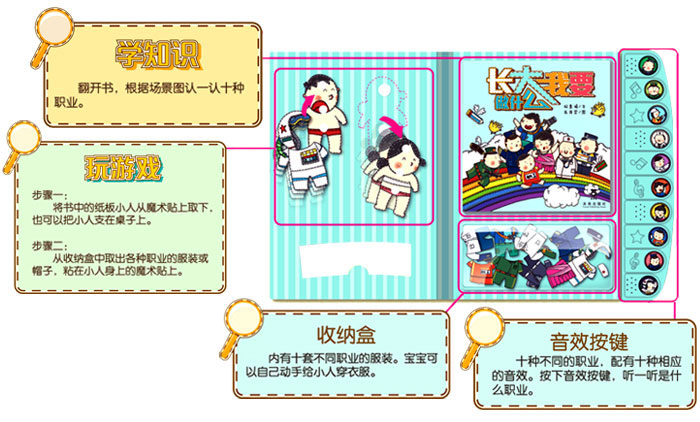 打开书,孩子第一眼就能发现两个用魔术贴粘在封面上的小人,小人身上也有几处魔术贴,这是干什么的呢?相信聪明的小朋友一定会立刻发现装在收纳盒的众多小衣服。拿出衣服就可以开始玩换装游戏啦。10套衣服展示10种不同职业,让孩子在游戏中轻松了解不同职业。