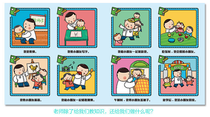 书的右侧有一排可以发声的按钮,小手戳进去按一按,孩子会听到关于10种职业标志性的声音。看图、听声音,让孩子对职业有个全方面多角度的认识。