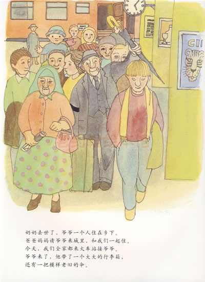 封面内侧描述的是奶奶生前与爷爷在一起的美好时光,后来奶奶生病、去世,爷爷准备到城里。紧接着扉页中间有一幅彩色图画,是爷爷坐在火车内,所以故事很自然的从爷爷下火车出站开始了。封底内侧则是爷爷从城里回去后一个人孤单寂寥的生活片段,最后一幅是我们全家去看爷爷。前后形成一种对照,整个故事也有了前因后果,非常完美。这三页很容易让人忽视掉,所?一定不能错过。