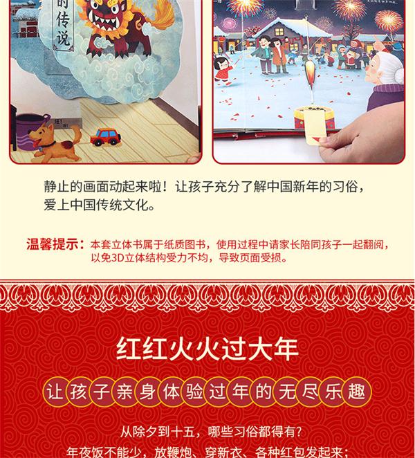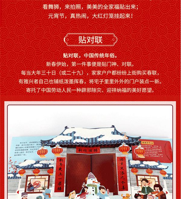 1、立体纸艺互动机关:3D立体纸艺和精巧的互动机关让孩子进入“立体”的新年里,亲自体验传统新年的乐趣。