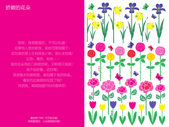 哎呀,我很脆弱的,不可以乱碰!如果有人想折断我,那他可要倒霉了!因为我的茎上生有很多小刺,很扎手的哦!红色、黄色、粉色等等,我的花朵有好几种颜色呢,又鲜艳又美丽!我不但好看,还好闻!很多香水和食物里,都有属于我的味道。看到右边美丽的花园了吗?找到我,闻闻我盛开时的香味吧!这种娇嫩又迷人花朵会是谁呢?