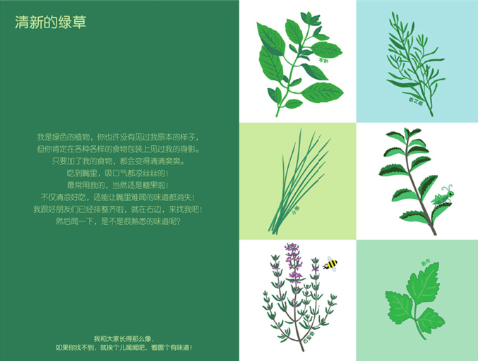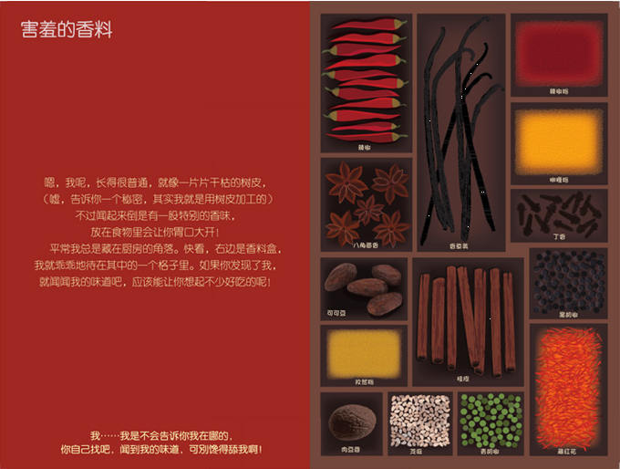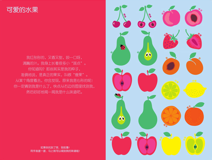 翻开书,香味扑鼻而来,孩子可以根据气味的不同辨识物品,比如洋葱是刺鼻的,薄荷是清凉的,通过嗅觉认知建立对物品的记忆。