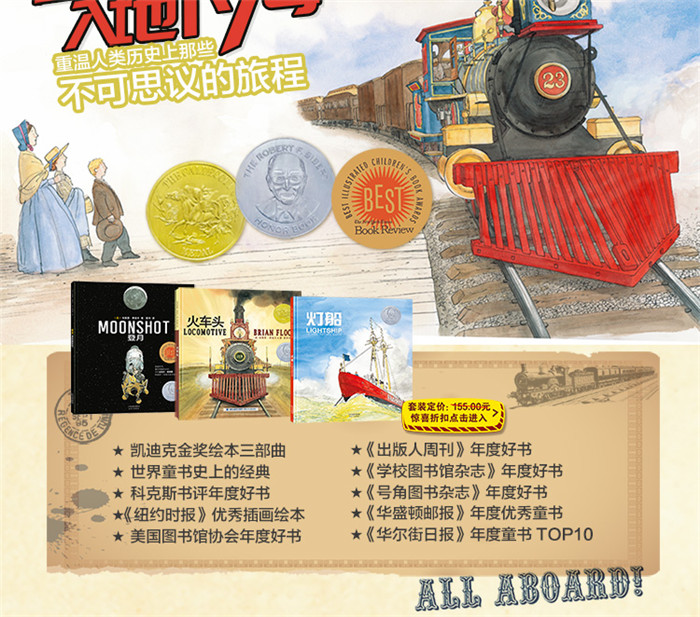 《火车头》《灯船》《登月》是美国著名童书作家布莱恩·弗洛卡的代表作,也是世界童书史上的经典。三书“陆海空”并举,讲述那些动人的历史瞬间。《火车头》讲述美国第1条跨洲铁路的修筑过程,再现人类交通史上的壮举;《灯船》让早已被遗忘的灯船重回公众视野,再现灯船的平凡和伟大;《登月》讲述“阿波罗11号”的伟大征程,再现人类登月时刻。