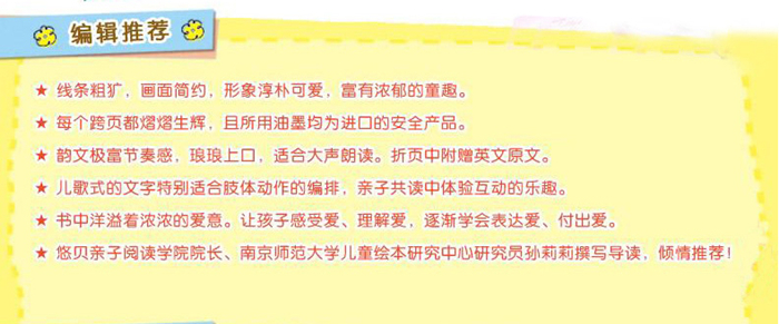 父母都会被这套温暖的绘本吸引,孩子在阅读这套书时会觉得安心,理解自己是被呵护着的。明亮大胆的用色、精心设计的图画,配上俏皮温暖的短句,将孩子成长中的喜悦与悲伤浓缩进字里行间。书架上放上这套书会令人幸福,适合亲子共读,共享温馨时刻。