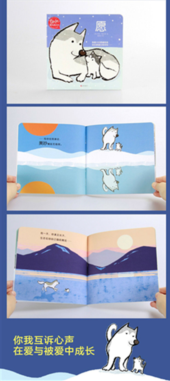 《愿》选自暖房子亲子共读绘本《爱的表白书》。本书用可爱温馨、细腻舒畅的图画展现了狼妈妈和小狼的日常生活场景:我爱与你齐头并进,昂首前行。