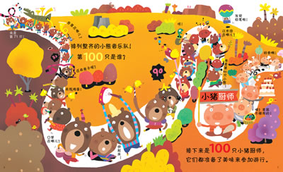 《100只动物大游行》用孩子最喜爱的主角──动物,让孩子学会按物点数,从1数到100,说出数数的结果,获得数概念中“算数”的能力;而在数数的过程中,同时也让孩子了解到数字1,2,3……的顺序关系。在画面中,插画家濑边雅之也让小动物给了一些提示:“我是熊熊第32号”、“第9号小猪”……等,让孩子能够轻易掌握第1,第2,第3……的序数关系。除此之外,孩子还可以挑战进阶的数数方式,运用10个一数的方式,数一数100只正在游行的动物们!