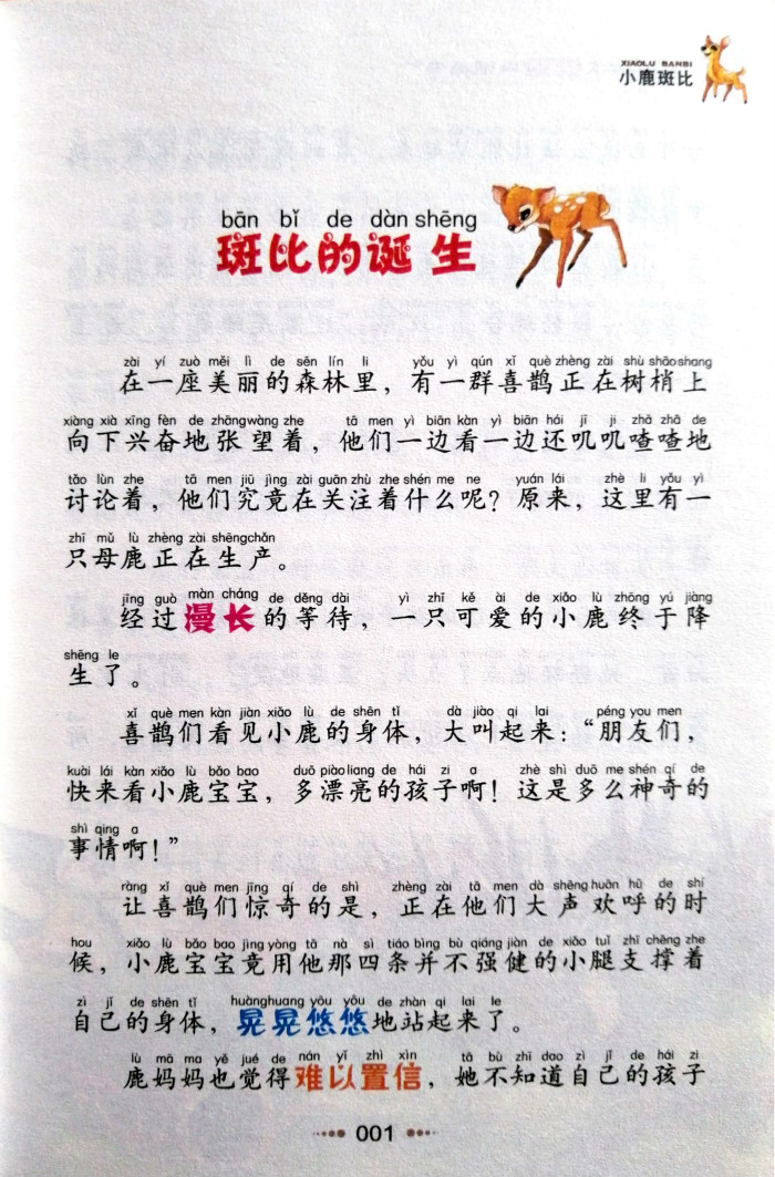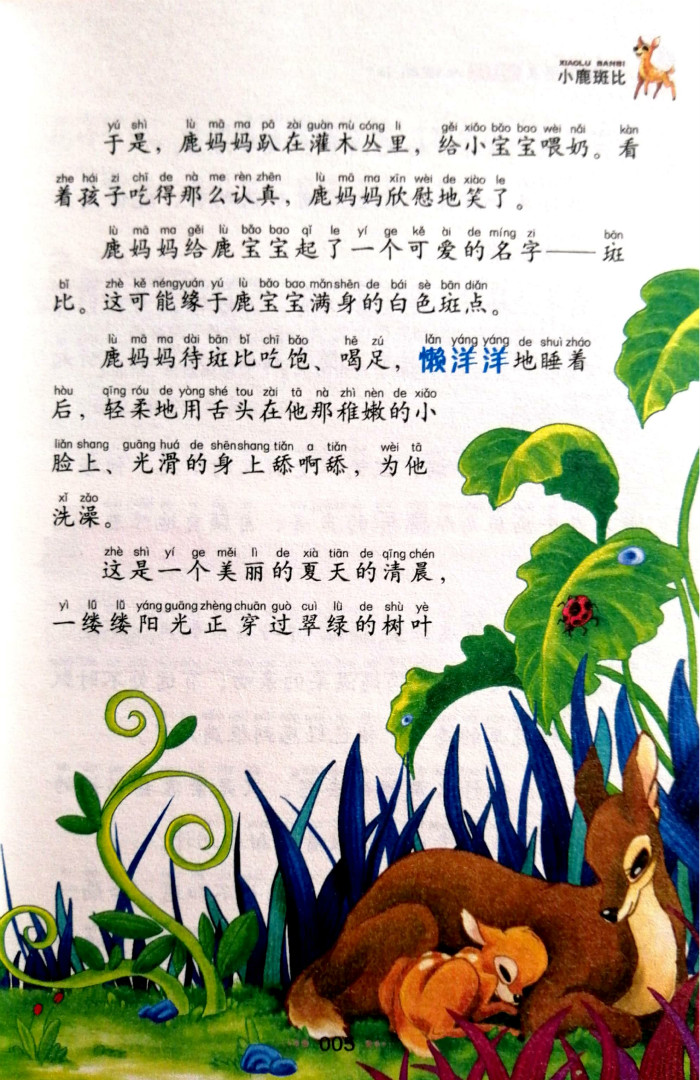 《小学生语文新课标必读丛书:小鹿斑比》讲述的是一只鹿的成长故事,从他刚出世不久一直讲到他成年。森林中生活着一群可爱的小生灵,他们是小鹿斑比、小白兔加纳、臭鼬花吉等,他们经常在一起玩耍。斑比在妈精心抚育和耐心指导下,渐渐长大。他不但学会了生存的本领,还了解到越来越多的知识。他知道还有其他的小鹿,跟妈妈一起生活;还有一些威严而俊美的雄鹿,他的爸爸就是他们中的一员。他渐渐习惯了有时离开妈妈,自己独处一段时间;他渐渐懂得了如何与同类中的同伴、长者,还有其他种类的动物们相处;他学会了帮助朋友,也从朋友那里获得了帮助。这一切与孩子的成长经历非常相似。不过斑比的妈妈一直在告诫他,森林里存在着“危险”,可是他一点儿也不明白“危险”是什么,他要好的伙伴法林、郭波也不明白。直到有一天,斑比在森林里见到一个特别的动物,这个动物用两条腿直立着,看见斑比后,“他从挨近他脸部的高处伸出了一条腿”。斑比本能地逃跑了,虽然他还不知道那个动物就是“人”,那伸出来的一条腿,就是能顷刻间置他于死地的“枪”——这就是森林动物们大的危险。