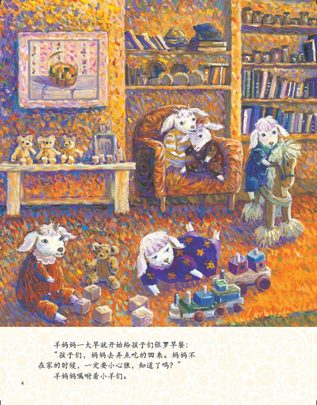 妈妈一大早就开始给孩子们张罗早餐:“孩子们,妈妈去弄点吃的回来。妈妈不在家的时候,一定要小心狼,知道了吗?”羊妈妈嘱咐着小羊们。