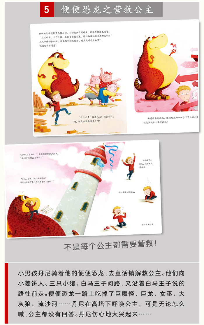 小男孩丹尼骑着他的便便恐龙,去童话镇解救公主。可是,走着走着,他们迷路了。他们向小姜饼人、三只小猪、白马王子问路,又沿着白马王子说的路往前走。便便恐龙一路上吃掉了巨魔怪、巨龙、女巫、大灰狼、流沙河……丹尼在高塔下呼唤公主,可是无论怎么喊,公主都没有回答。丹尼伤心地大哭起来,他们可以成功解救公主吗?