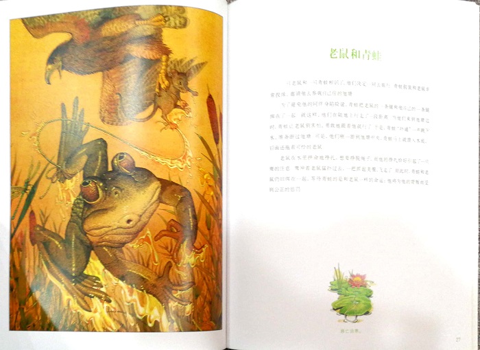 在《拇指姑娘》里,那些深褐色的灵动轻盈的线条,画出了古老鹅毛笔才能画出的效果,色彩的晕染也与这些线条彼此和谐,仿佛穿旧的衣裳一样自然随意,让我们感受到一种悠远的真实《七只乌鸦》、《伊索寓言》里的画面也有这样的特点。