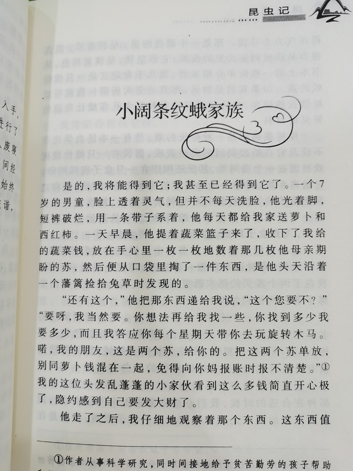 《昆虫记》一书描述了小小的昆虫在自然法则的支配下,为了生存和繁衍不懈努力和斗争的过程。 在书中,法布尔依据其毕生从事昆虫研究的经历和成果,以人性观照虫性,用通俗易懂、生动有趣的散文笔调,深入浅出地介绍了他所观察和研究的昆虫的自然形态、生物习性,真实地记录了昆虫的本能、习性、劳作、死亡的状态,既传播了科学知识,又表达了对生命和自然的热爱和尊重。