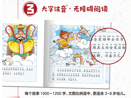 原著故事结构庞大,《西游记幼儿美绘本》从儿童视角筛选内容,在汇总与原著的基础上进行缩写改编,通俗易懂,并配以大字注音,真正实现无障碍阅读。