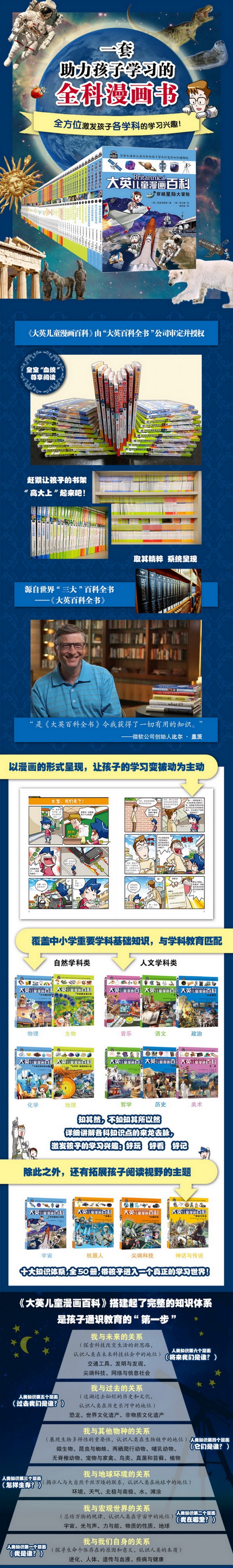 《大英儿童漫画百科》采用崭新的图形和绘制技术精心打造,以孩子们的兴趣点为中心,完整构建知识领域,全方位满足少年儿童的知识需求。它以《大英百科全书》的内容知识为基础,通过色彩鲜明、形式活泼的漫画和生动有趣的故事,为孩子深入浅出地讲述相关科学知识。